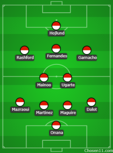 A backline consisting of Diogo Dalot on the left, Matthijs de Ligt and Lisandro Martinez in the middle, and Noussair Mazraoui on the right is expected to line up in front of him. The two recent additions will be looking to improve on a few underwhelming weeks.