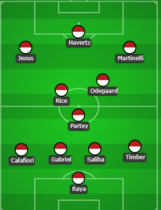 Thomas Partey may join Declan Rice and Martin Odegaard as a partner. Kai Havertz may assume the number nine position, while Leandro Trossard could be relegated to the bench.